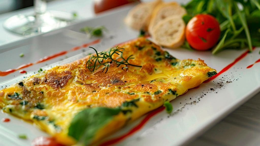 Disfruta de una elegante tortilla a las finas hierbas, dorada y cuidadosamente plegada. Acompañada de una fresca ensalada y pan tostado, es una delicia ligera y sofisticada.